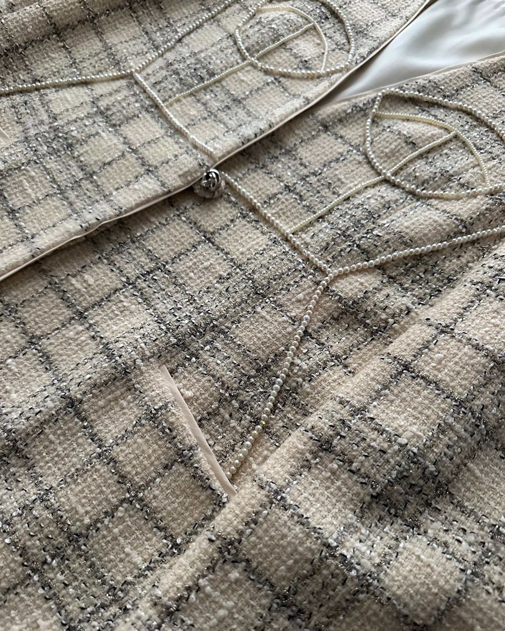A one-of-a-kind vintage tweed blazer in ivory, finished with hand-beaded corset embroidery.